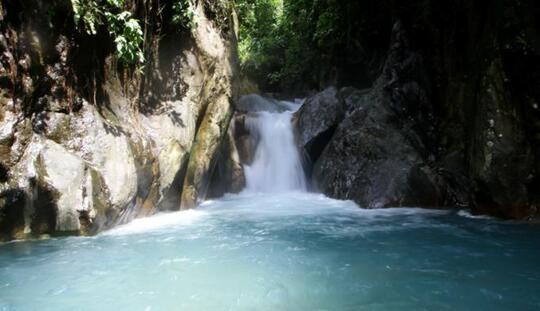 Kolam alami yang berair biru jernih ini sangat indah dengan dikelilingi batu alam dan air terjun.